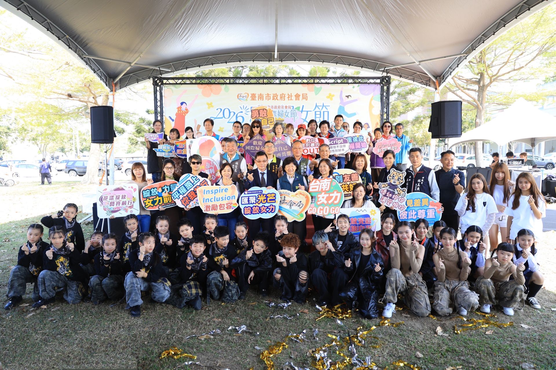 為響應2026年國際婦女節,臺南市社會局於今(8)日在永華市政中心旁西拉雅廣場盛大舉辦「歡慶2026國際婦女節-匯聚光芒,綻放女力」活動。副市長姜淋煌率社會局長郭乃文及市府團隊各首長共同出席,透過象徵資源連結與支持給予的「金色光球」揭開活動序幕,宣示市府將持續攜手社會各界,成為女性堅實的後盾,綻放女性多元發展與無限可能。立委陳亭妃、林俊憲、市議員王家貞、黃麗昭、李啟維、沈震東、議長邱莉莉、議員郭信良、林美燕及陳怡珍等服務處均派員出席,另有性別平等及婦女權益促進委員會委員徐珊惠、邱麗夙、許玉靜、童氏容及婦女團體代表們共同響應盛會。