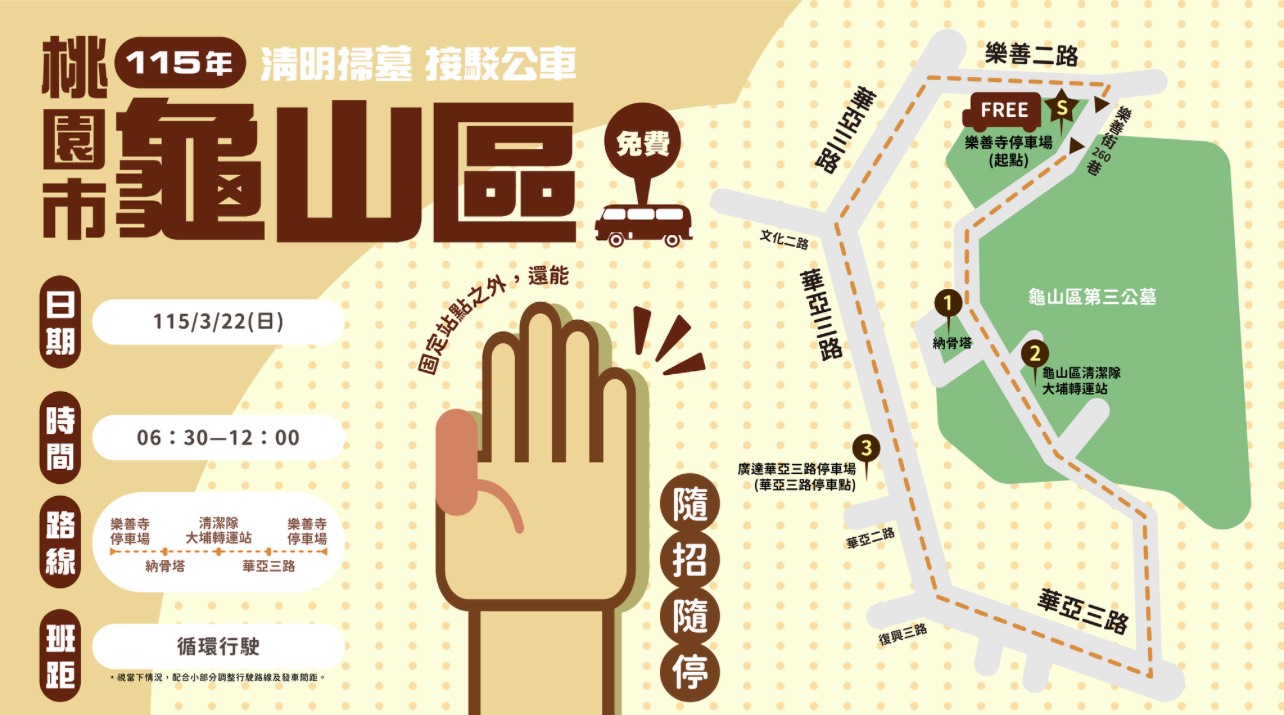 因應清明掃墓可能帶來人潮聚集等問題,市府在各公墓、納骨塔或生命紀念園區等地採取人潮分流及疏散對策,讓民眾能夠提早前往掃墓,透過前三個星期的周末假日彈性運用,以大幅紓解掃墓人潮。115年度桃園市政府推出的掃墓專車共計5條路線,詳細路線行駛時間如附表。