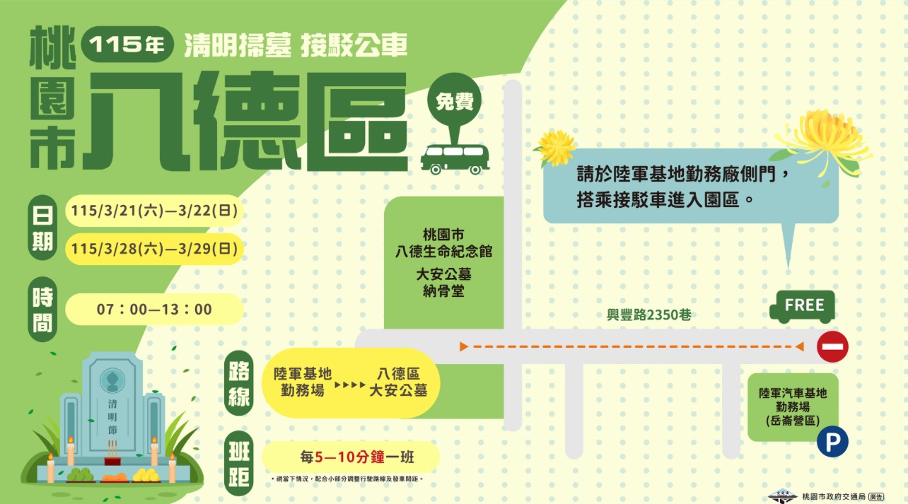 【 視傳媒記者袁慧心/桃園報導】清明節將至,為方便民眾祭祖掃墓,桃園市政府於蘆竹、八德、楊梅、龜山區提供清明掃墓接駁專車,免費接送掃墓民眾往返墓區,以減少民眾使用私人運具,歡迎掃墓民眾多加利用。