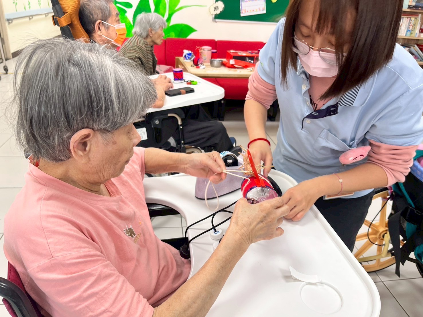 永春護理之家院長王曉嵐表示,這類結合手工藝設計的活動,不只是單純的娛樂,同時也能促進長輩的 手眼協調與精細動作能力。在穿繩、黏貼與組裝的過程中,長輩需要專注於步驟與形狀判斷,也能帶來適度的 認知刺激與專注力訓練。當長輩一步一步完成作品時,也能從「我做得到」的過程中獲得成就感,進一步 提升自信心與自我價值感。